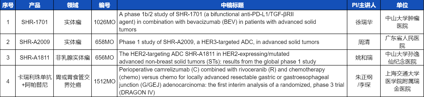 本次ESMO大会,将由中山大学肿瘤医院徐瑞华教授、广东省人民医院周清教授、中山大学孙逸仙纪念医院姚和瑞教授、上海交通大学医学院附属瑞金医院李琛教授分别就4项PG医药创新产品相关研究做口头报告,包括SHR-1701、SHR-A2009、SHR-A1811这3款未上市创新产品的实体瘤治疗临床研究,以及1项“双艾”组合(卡瑞利珠单抗联合阿帕替尼)治疗局部晚期可切除胃/胃食管交界处癌的Ⅲ期临床试验期中分析。