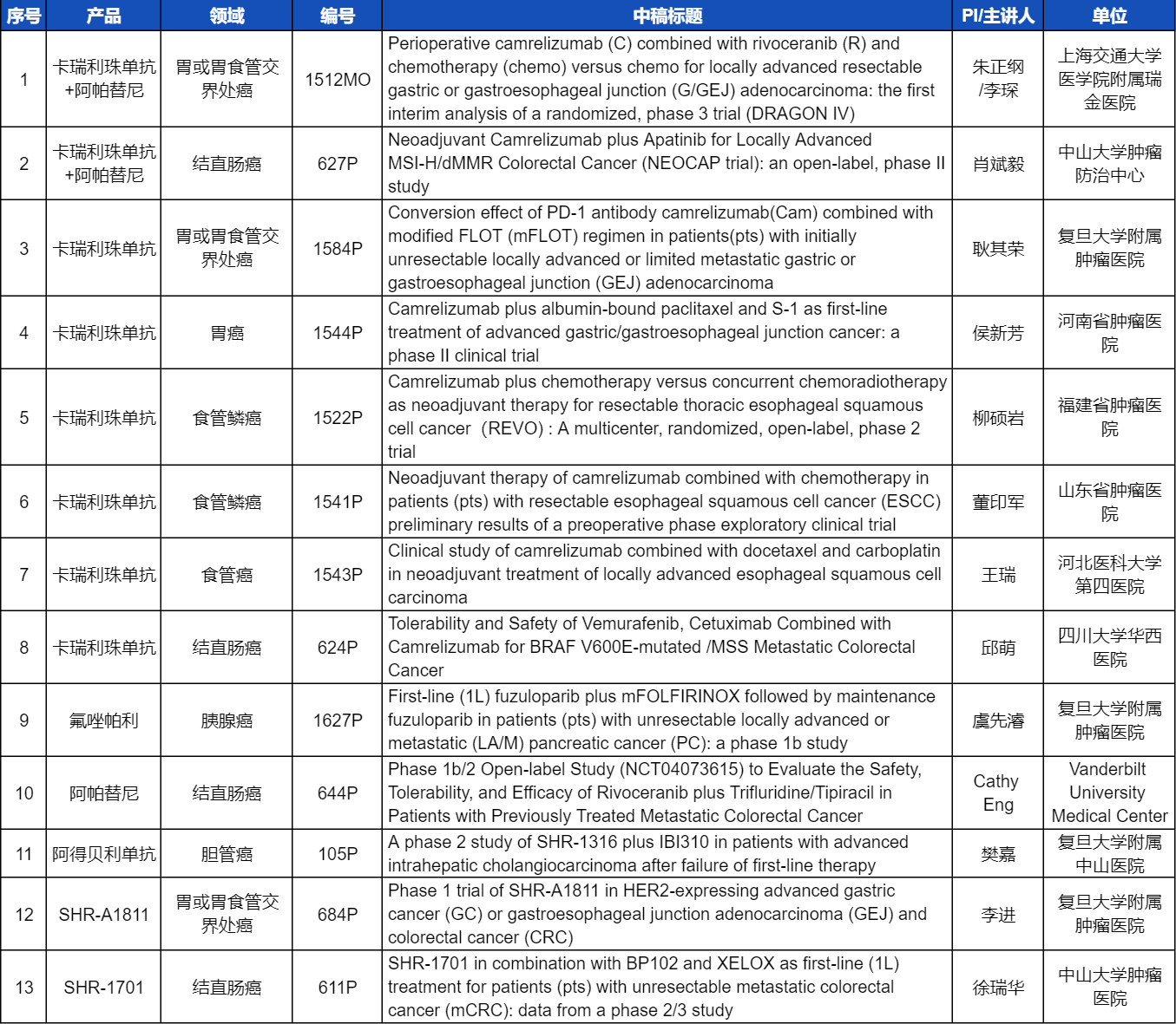 在消化系统肿瘤领域,PG创新产品相关研究共入选1项口头报告和12项壁报展示。除了经典的明星药物卡瑞利珠单抗和阿帕替尼,SHR-A1811、SHR-1701等未上市创新产品也有相应研究入选。此外,阿得贝利单抗、氟唑帕利等已上市药物也在积极探索新的适应症,本次ESMO大会分别有肝内胆管癌和胰腺癌相关研究入选。这些新老药物前沿研究的不断出现,有望为消化系统肿瘤患者带来新的福音!