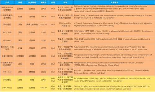 14款创新药包括10款已上市产品:注射用瑞康曲妥珠单抗(艾维达®,研发代号:SHR-A1811)、注射用卡瑞利珠单抗(艾瑞卡®)、苹果酸法米替尼胶囊(艾比特®)、甲磺酸阿帕替尼片(艾坦®)、马来酸吡咯替尼片(艾瑞妮®)、阿得贝利单抗注射液(艾瑞利®)、羟乙磺酸达尔西利片(艾瑞康®)、氟唑帕利胶囊(艾瑞颐®)、瑞维鲁胺片(艾瑞恩®)、海曲泊帕乙醇胺片(恒曲®),以及4款未上市产品,包括KRASG12C抑制剂HRS-7058、KRASG12D抑制剂HRS-4642、抗PD-L1/TGF-βRII双抗瑞拉芙普-α注射液(SHR-1701)、Trop-2 ADC SHR-A1921。2类新药盐酸伊立替康脂质体注射液(II)(越优力®)及国内首仿药昂丹司琼口溶膜(艾其速®)各有1项研究入选。